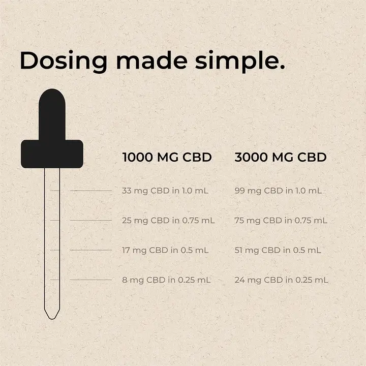 Actives (per 0.5 mL): 1000 mg: 17 mg CBD | 3000 mg: 50 mg CBD
