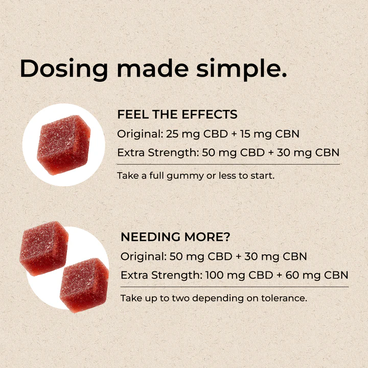 Original Actives (per gummy):ย 25 mg CBD, 15 mg CBN, 50 mg L-Theanine, 25 mg Passion Flower Extract.
